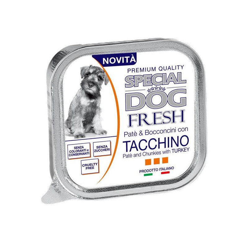 Scadenza: 4 anniDimensioni: L100*W100*H28mmPeso: 150gUnità : 1Imballaggio unità: scatolaQ.tà imballaggio esterno: 24Usi: CaniImballaggio esterno: scatole / ctnDescrizione: Special dog fresh with chicken is acomplete food with soft pâté and many tidbits to delight your faithful friend. a recipe that combines the creaminess of steamed paté with the flavor...