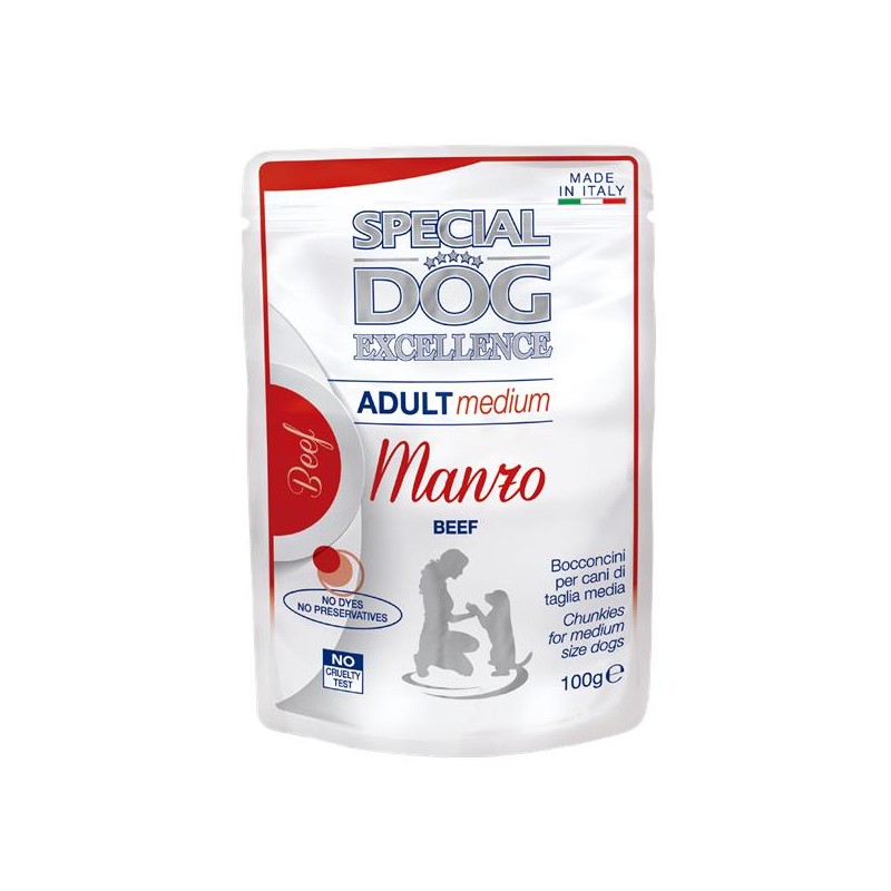 The morsels with beef are acomplete food for medium-sized adult dogs, aged between 1 and 8 years. meats and derivatives 45% (of which min. 5% beef), vitamins, mineral salts.