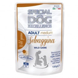 The morsels with game area complete food for medium-sized adult dogs, aged between 1 and 8 years. meats and derivatives 45% (of which min. 5% game), vitamins, mineral salts.